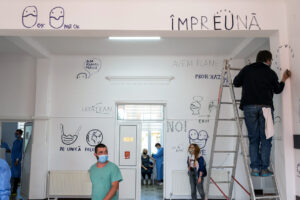 Dan Perjovschi, artist cunoscut la nivel internațional, a desenat la Centrul de Vaccinare din Fierbinți, la invitația medicului din localitate, Eugen Vuțescu, la rândul lui pictor și scriitor.