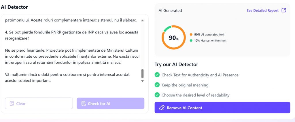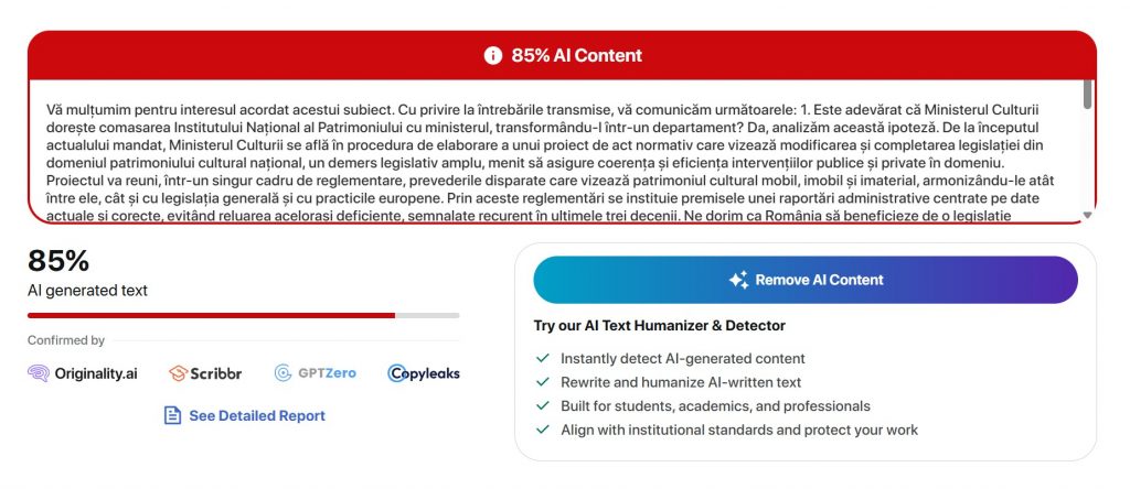 Potrivit mai multor aplicații de AI pe care le-am interogat, textul transmis de Ministerul Culturii către redacția noastră este generat în proporție de peste 85% de AI.
